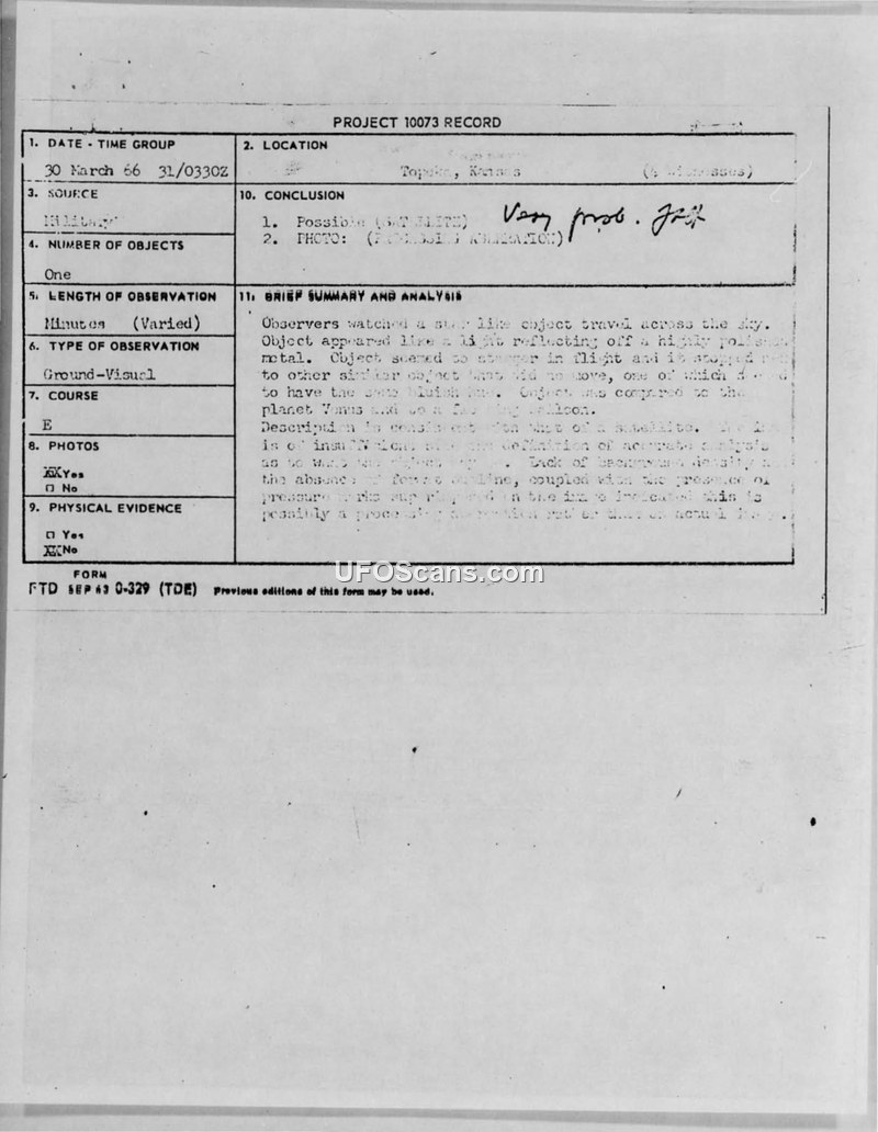 Project 10073 Record: UFO Sighting at Forbes AFB, Kansas, 30 March 1966