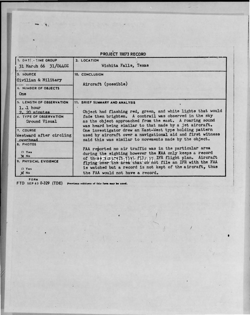 Project 10073 Record — Sighting at Wichita Falls, Texas, 31 March 1966