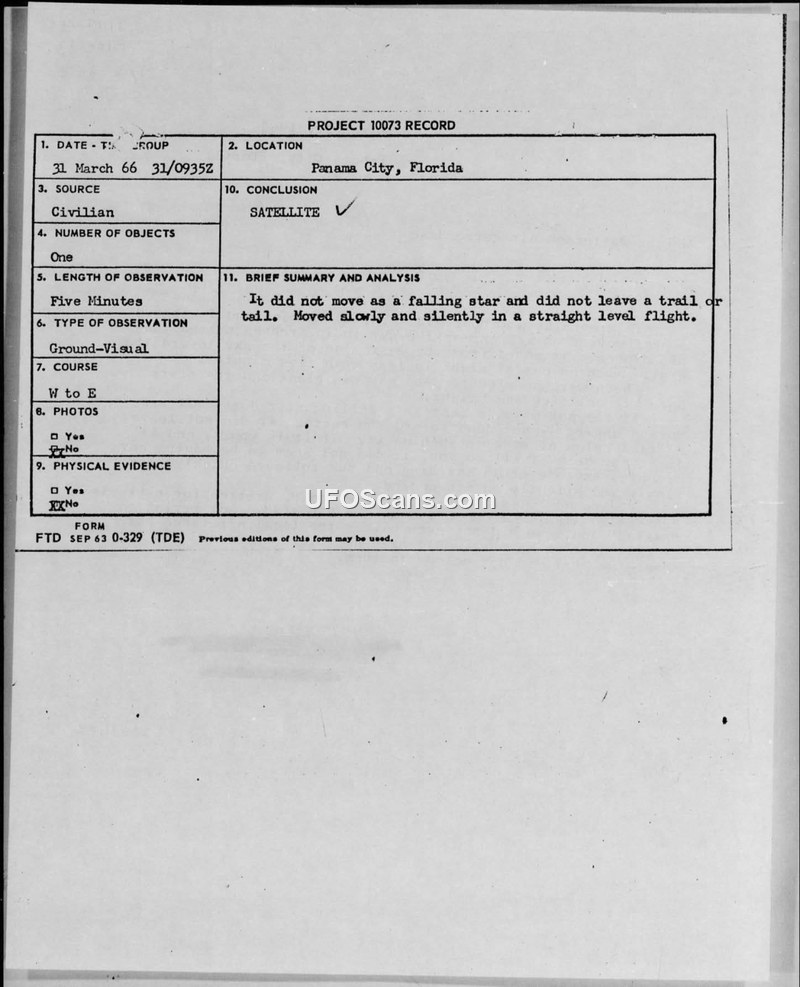 A civilian report of an unidentified object in Panama City, Florida, on March 31, 1966, was officially classified as a satellite by Project 10073.