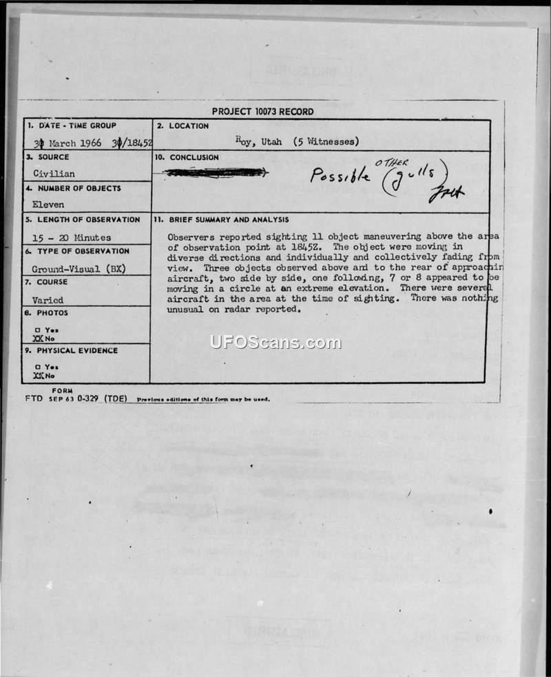 A report of eleven unidentified objects seen over Roy, Utah, on March 31, 1966. Despite the witnesses being deemed credible, the official conclusion suggested the objects were possibly gulls.