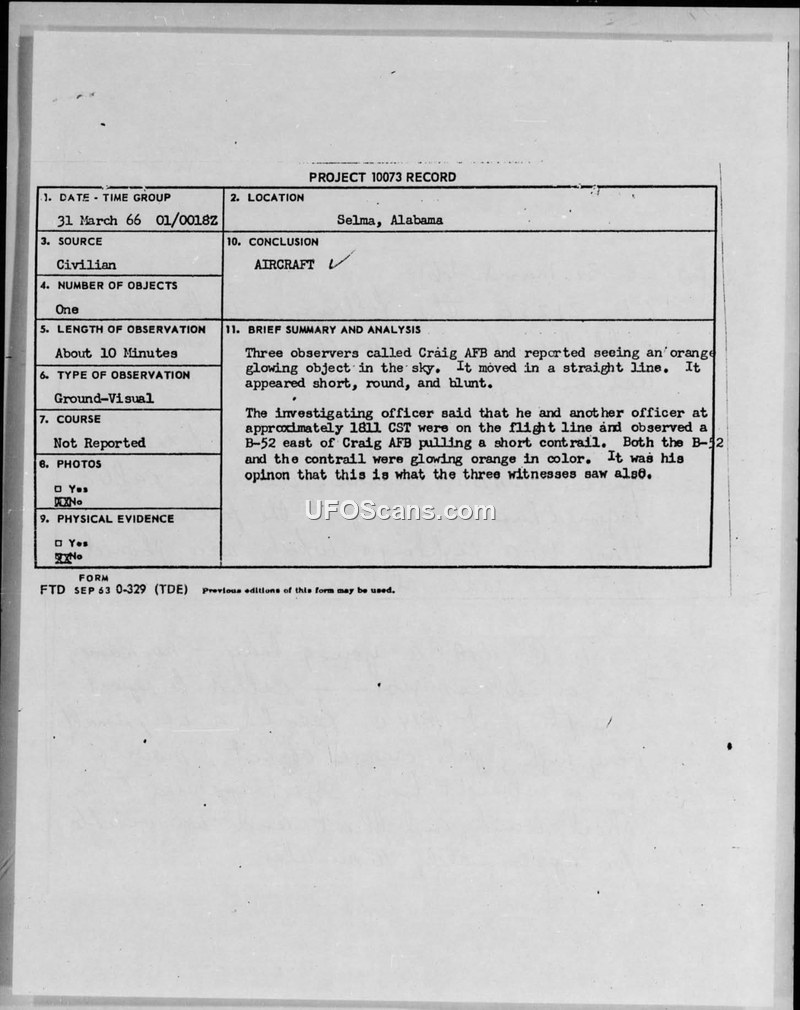 On March 31, 1966, multiple reports of an unidentified aerial phenomenon were received by Craig Air Force Base in Selma, Alabama. The reports originated from calls made to local radio station WHBB, which then contacted Major Chapman at the base. The first report came from an unidentified young woman who described a very small, very high, pale orange object that appeared short, round, and blunt, moving in a straight line for approximately ten minutes. Shortly thereafter, two additional reports were received: one from a male adult in downtown Selma who reported an 'orange blob' and another from a young man who reported an 'orange glow' high in the sky. Major Chapman, the investigating officer, conducted an analysis of the events. He noted that at approximately 1811 CST, he and another officer were on the flight line at Craig AFB and observed a B-52 aircraft flying east of the base. The aircraft was pulling a short contrail, and both the aircraft and the contrail were observed to be glowing orange in color. Major Chapman concluded that this B-52 and its contrail were the source of the sightings reported by the witnesses. The document notes that radio station WHBB possessed a tape recording of the initial conversation regarding the sightings.