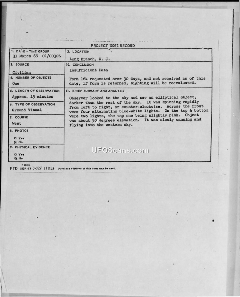 A civilian reported an elliptical UFO in Long Branch, New Jersey, on March 31, 1966. The Air Force closed the case as 'Insufficient Data' after the witness failed to return a required follow-up form.