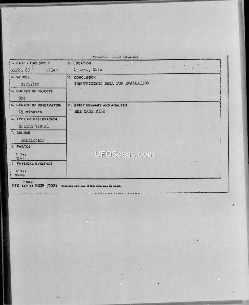 Project Blue Book Sighting Report — Urbana, Ohio, March 1966