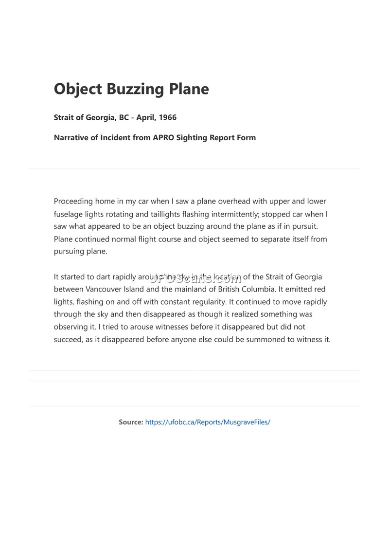 In April 1966, an unidentified witness was driving home when they observed an aircraft overhead in the Strait of Georgia, located between Vancouver Island and the mainland of British Columbia. The witness noted that the aircraft had its upper and lower fuselage lights rotating and its taillights flashing intermittently. Upon stopping their vehicle, the witness observed a second object that appeared to be 'buzzing' the aircraft as if in pursuit. The aircraft continued on its normal flight path, while the unidentified object eventually separated from the plane. The object then began to dart rapidly around the sky, emitting red lights that flashed on and off with constant regularity. The witness attempted to find other people to observe the phenomenon, but the object disappeared before anyone else could be summoned, seemingly as if it realized it was being watched.