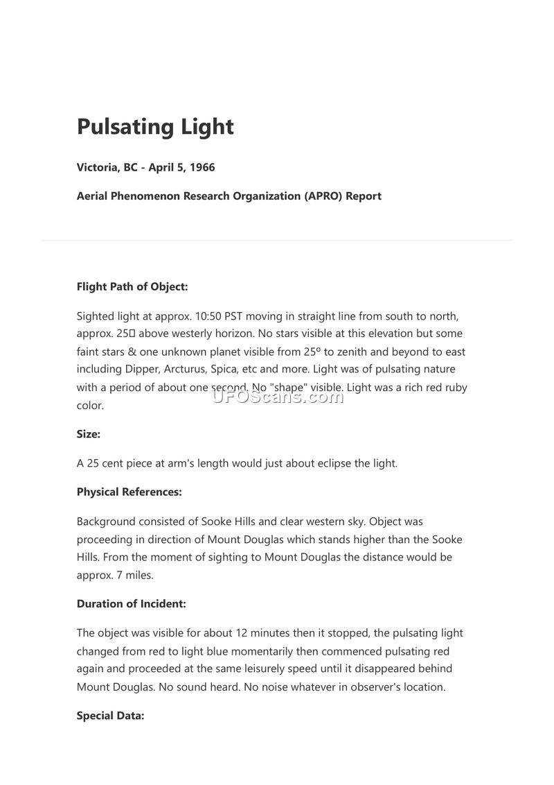 A technical professional in Victoria, BC, reported a 12-minute sighting of a pulsating red light on April 5, 1966. The observer, citing his background in navigation and radar, ruled out conventional explanations for the object's behavior.