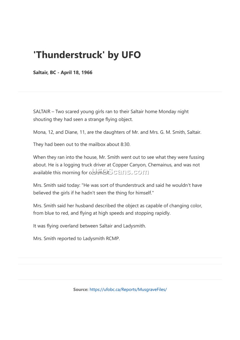On the night of Monday, April 18, 1966, two young girls, 12-year-old Mona and 11-year-old Diane Smith, returned to their home in Saltair, British Columbia, in a state of distress after observing an unidentified flying object. The girls had been at their mailbox at approximately 8:30 PM when the encounter occurred. Upon hearing their account, their father, Mr. G. M. Smith, a logging truck driver based in Copper Canyon, Chemainus, went outside to investigate. Mr. Smith reportedly observed the object himself, later describing it as being capable of changing color from blue to red, and exhibiting the ability to travel at high speeds before stopping rapidly. The object was observed flying overland between the communities of Saltair and Ladysmith. Mrs. Smith, who was not present for the sighting, later reported the incident to the Ladysmith RCMP. According to Mrs. Smith, her husband was 'thunderstruck' by the experience and admitted that he would not have believed the girls' account had he not witnessed the phenomenon personally.
