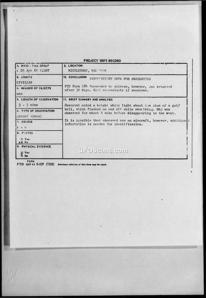 Project 10073 Record — Middletown, New York, 25 April 1966