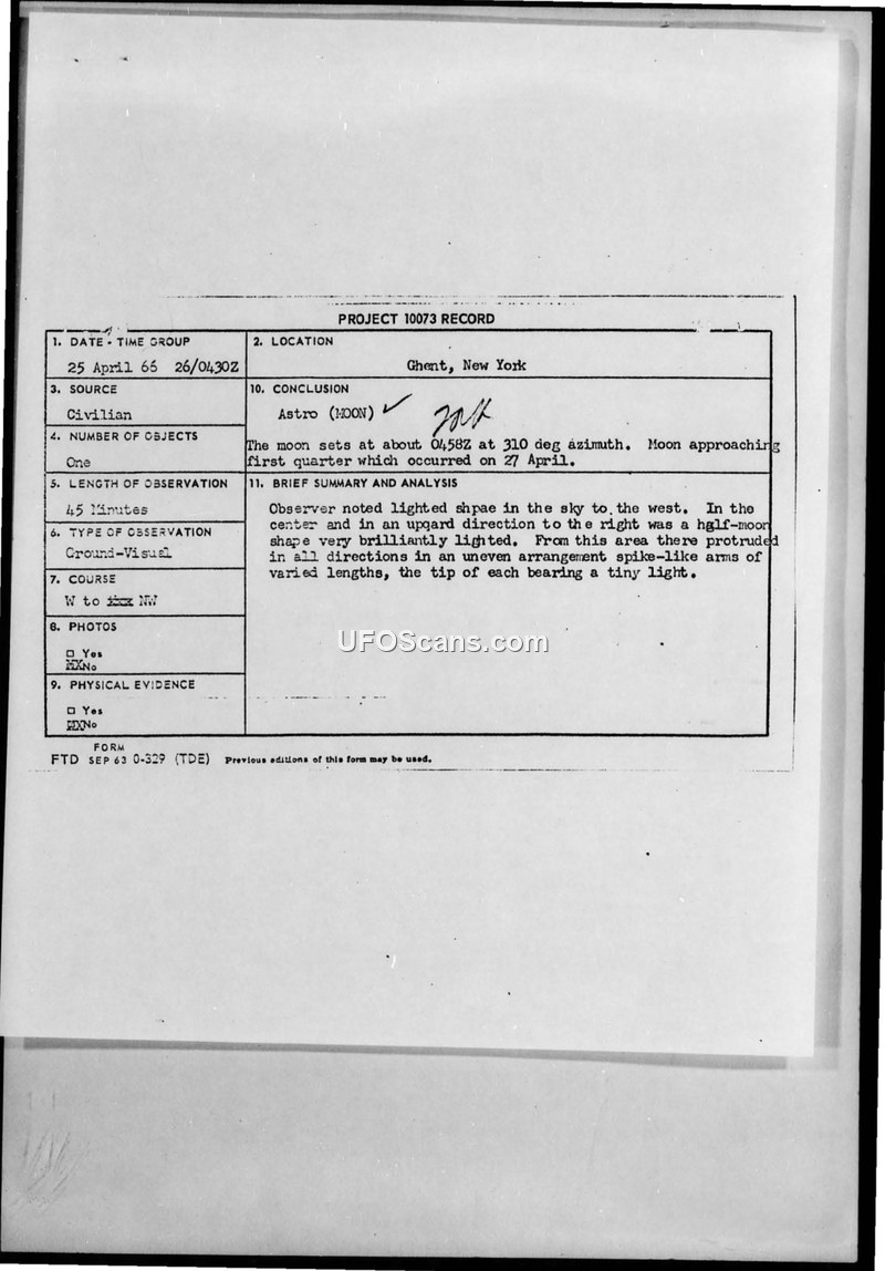 PROJECT 10073 RECORD — Ghent, New York, 25 April 1966