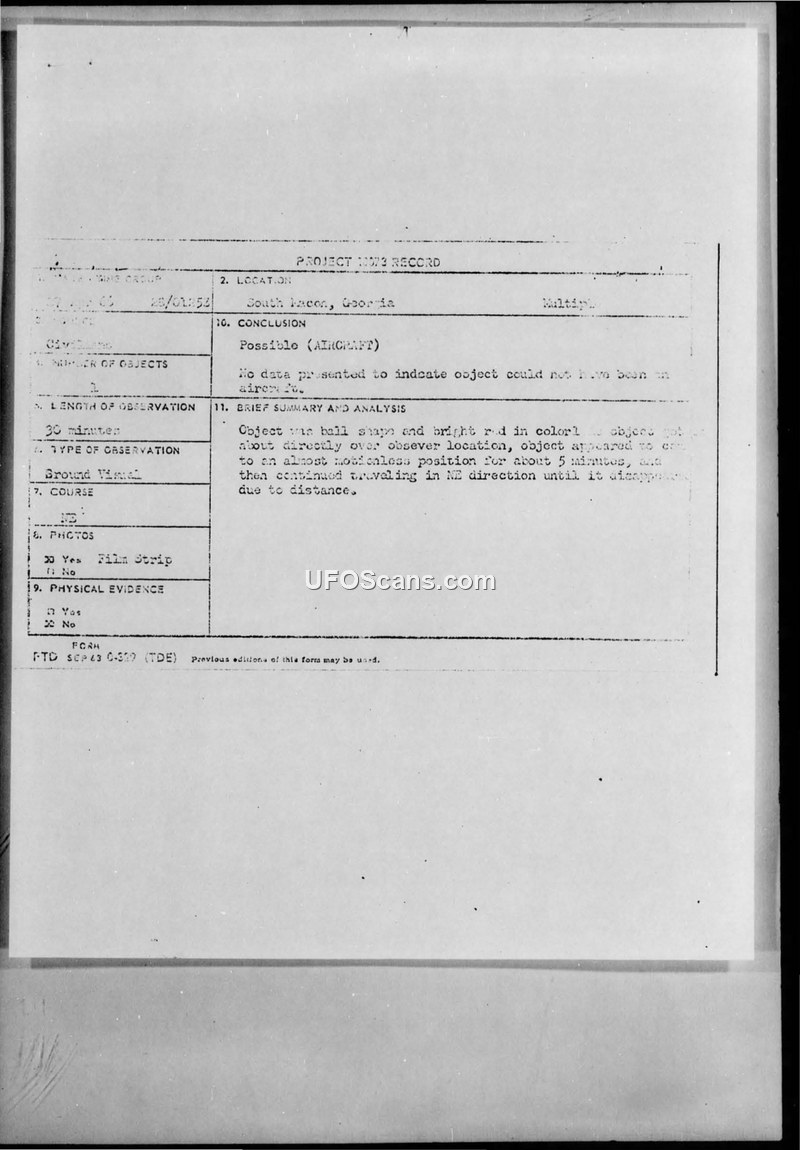 A 30-minute sighting of a bright red, ball-shaped object over Macon, Georgia, on 27 April 1966, was captured on film by a local newsman. Despite an investigation by Robins Air Force Base, no positive identification was made.