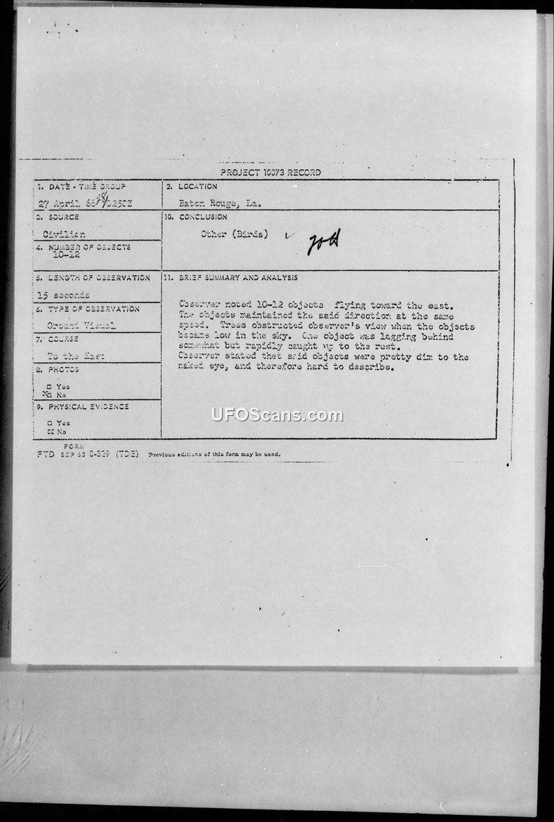 An 18-year-old in Baton Rouge reported seeing 10-12 bright objects in a V-formation on April 26, 1966. The Air Force's Project Blue Book investigation officially classified the sighting as 'Other (Birds)'.