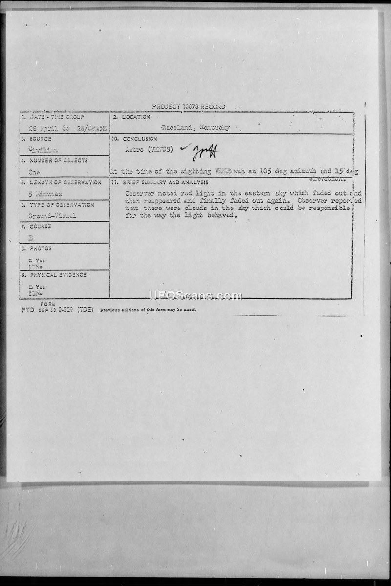 Project 10073 Record: Sighting Report - Raceland, Kentucky, April 28, 1966