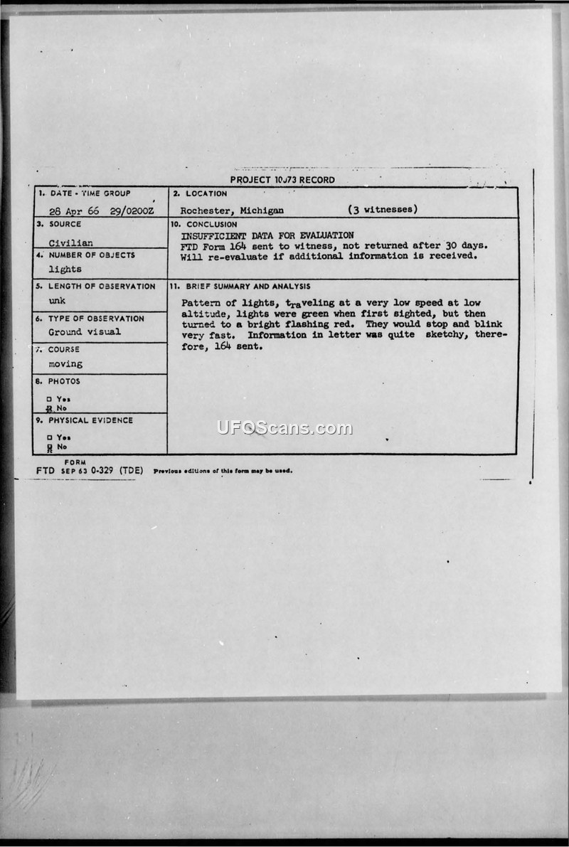 A civilian reported a sighting of unidentified lights in Rochester, Michigan, on April 28, 1966. Project Blue Book closed the case as 'insufficient data' after the witness failed to return a follow-up questionnaire.