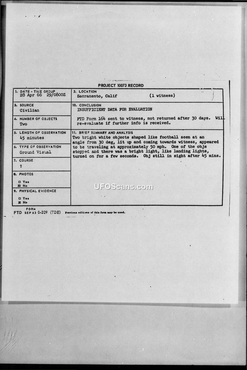 Project 10073 Record — Sacramento, California, 28 April 1966