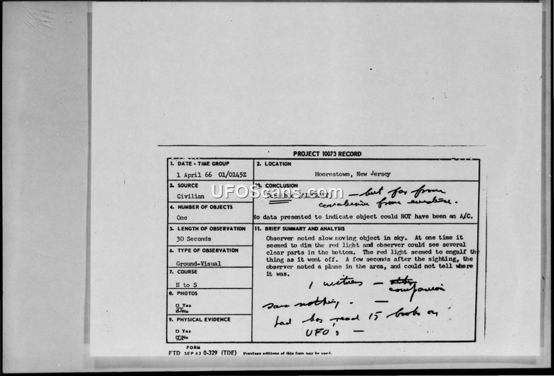 Project 10073 Record: Sighting Report - Moorestown, New Jersey, 31 March 1966