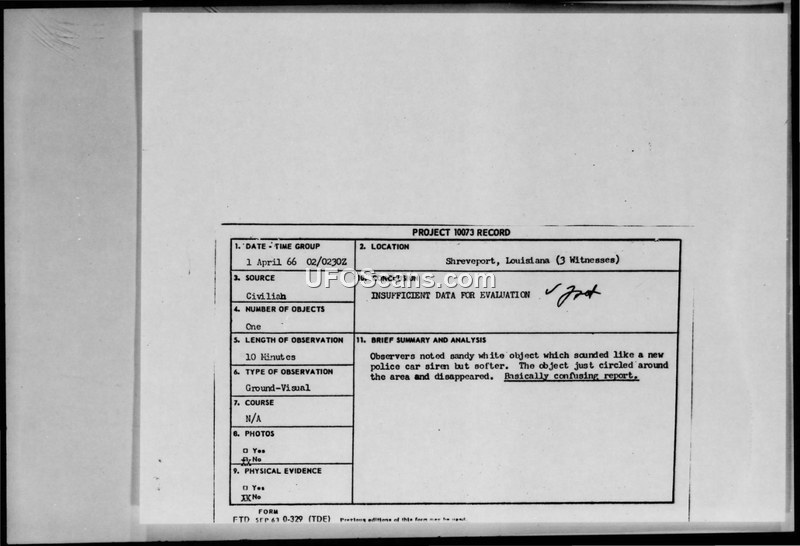 Project 10073 Record — Shreveport, Louisiana, 1 April 1966