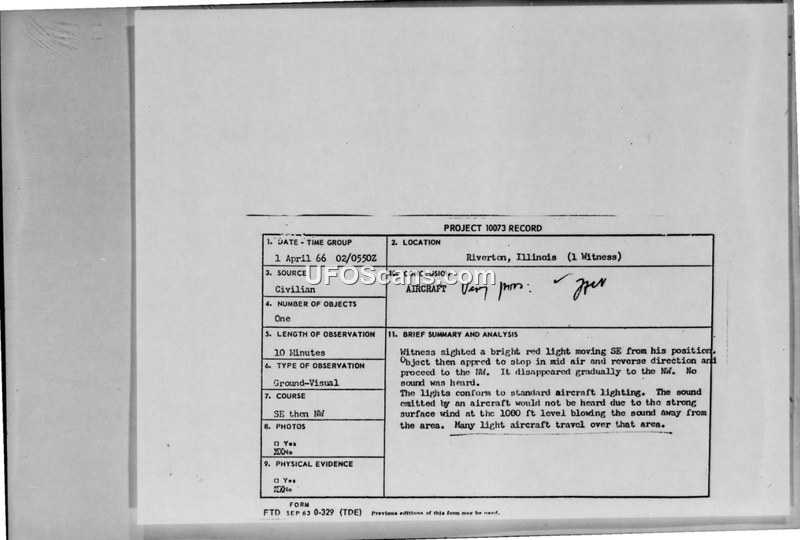 A civilian witness reported a bright red light in Riverton, Illinois, on 1 April 1966. The Air Force concluded the object was a light aircraft and deemed further investigation unnecessary.