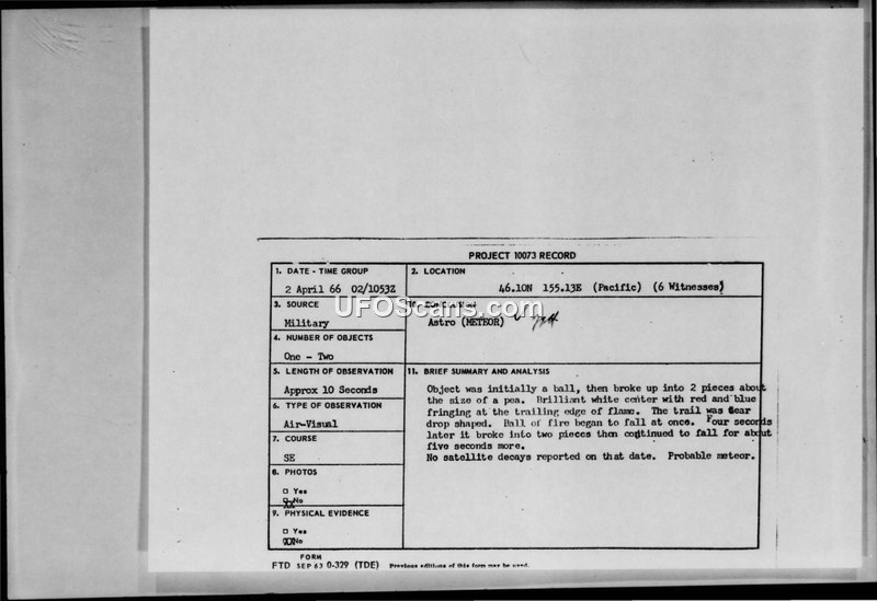 A military flight crew observed a ball of fire that broke into two pieces over the Pacific on 2 April 1966. The incident was investigated under Project 10073 and officially concluded to be a probable meteor.