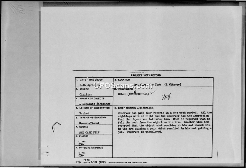 A series of reports from a single civilian in Brooklyn, New York, in April 1966 describing multiple UFO sightings. The Air Force concluded the reports were likely psychological or misidentifications of celestial bodies.