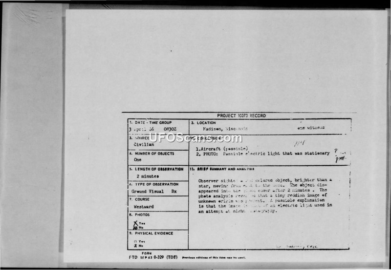 A 1966 UFO sighting in Madison, Wisconsin, involving student witnesses and photographic evidence, was investigated by the Air Force. The FTD concluded the photos were the result of camera movement while photographing a stationary light source.