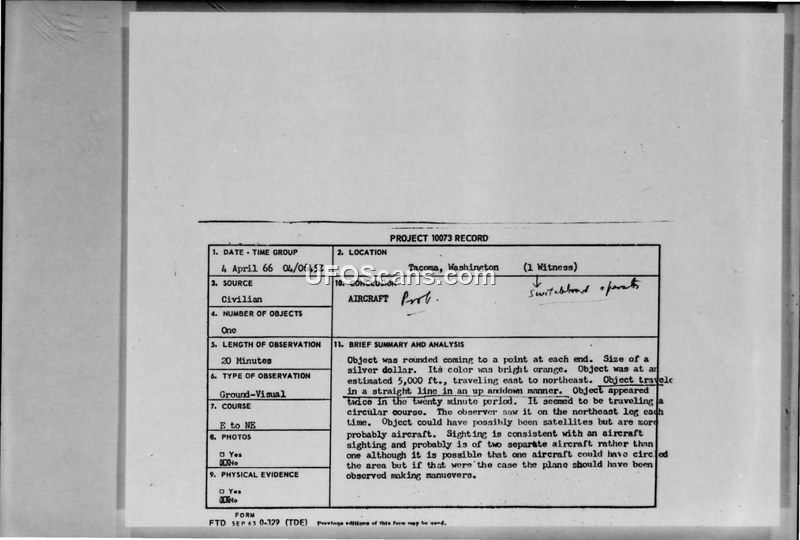 Project 10073 Record: Sighting Report - Tacoma, Washington, 4 April 1966