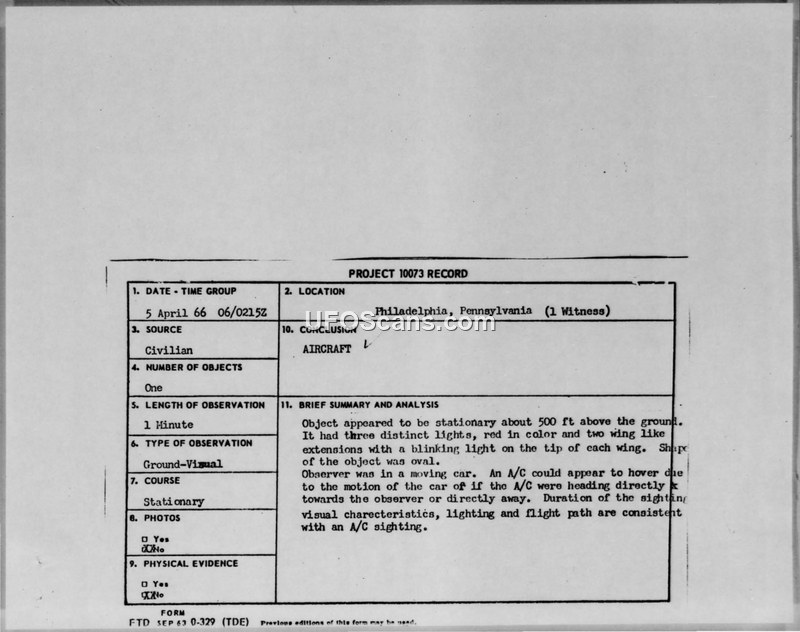 This document collection contains reports and correspondence regarding multiple UFO sightings in the Philadelphia, Pennsylvania area during April 1966. The records include a Project 10073 form detailing a sighting on April 5, 1966, where a witness observed an oval object with three red lights and wing-like extensions hovering 500 feet above the ground. The official conclusion for this incident was 'AIRCRAFT,' with the analysis suggesting the object's apparent hover was an illusion caused by the observer's moving vehicle. A second report from the 913th Troop Carrier Group details two additional sightings. On April 9, 1966, Miss Regina McFadden reported a circular, bright orange object larger than the sun that hovered over buildings in North Philadelphia for approximately ten minutes. On April 12, 1966, Mrs. Robert Curran reported a flying object that caused a 'very disturbing noise' and featured red and white lights. The Air Force contacted the Flight Operations section of Willow Grove Naval Air Station, which confirmed no aircraft were in the area at that time, though they noted the presence of industrial plants in the region that maintain test aircraft. The file also includes a questionnaire completed by a witness and correspondence from Major Hector Quintanilla, Jr., Chief of Project Blue Book, requesting further information from a witness due to insufficient data for evaluation. A separate Project 10073 record for an April 9, 1966, sighting notes 'CONFLICTING DATA' regarding the time and duration of the event, with a handwritten note stating that more technical data was needed before any evaluation could be made.