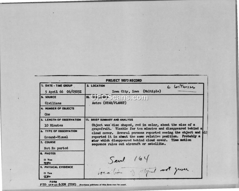 Project 10073 Record — Iowa City, Iowa, 5 April 1966