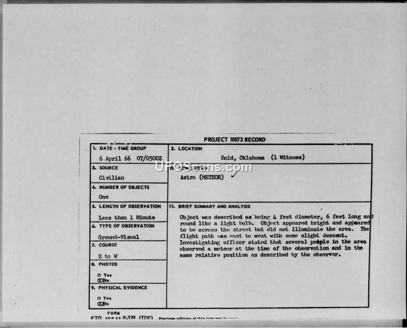 A civilian in Enid, Oklahoma, reported a light-bulb-shaped object on 6 April 1966. The Air Force investigation concluded the sighting was a meteor, citing corroborating reports from others in the area and potential depth perception errors.