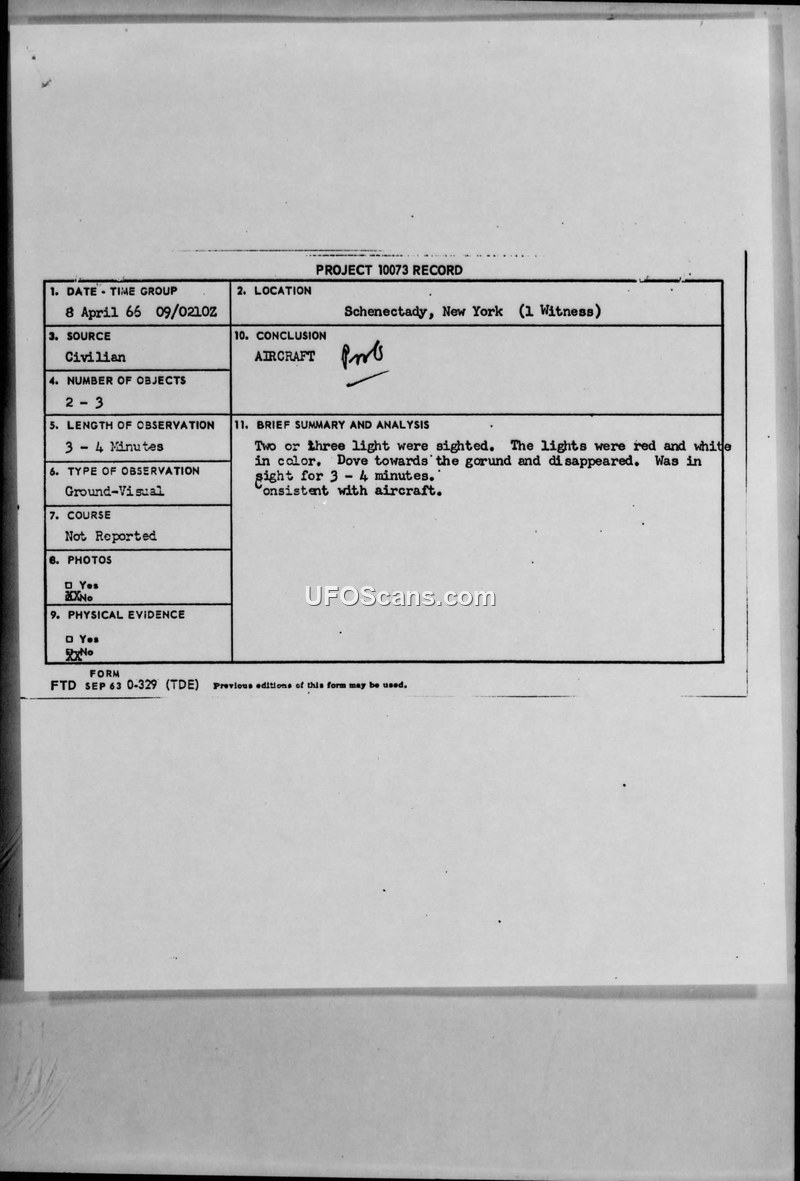 Project 10073 Record: UFO Sightings, Schenectady, New York, 8 April 1966
