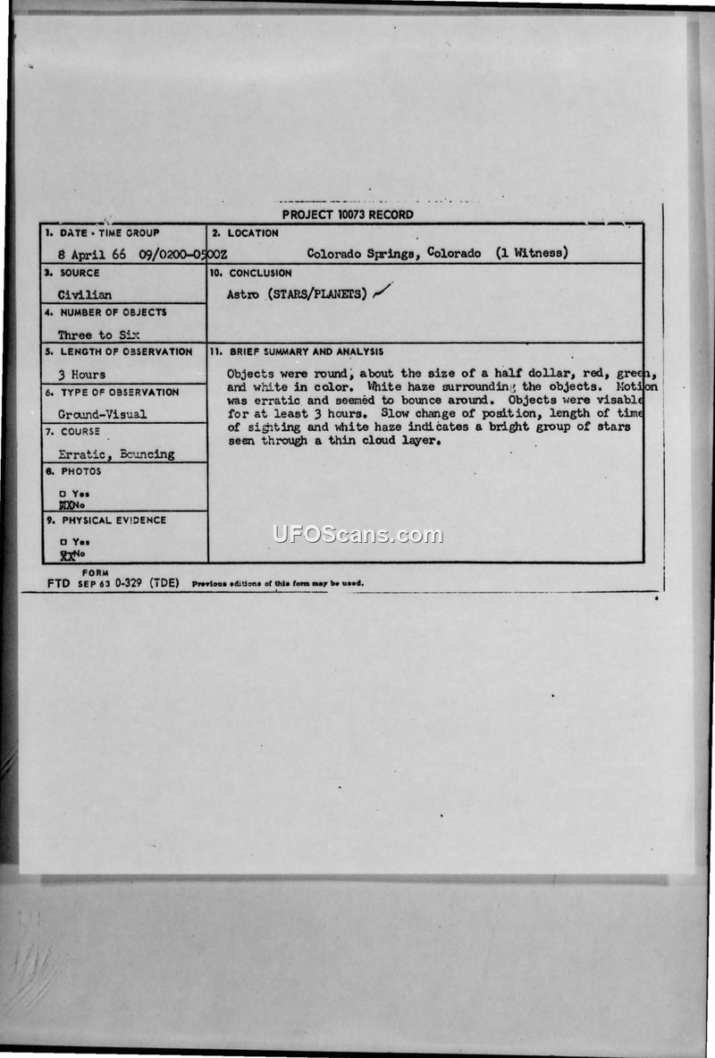 This collection of documents comprises a series of Project 10073 records and incoming Air Force messages from April 1966, documenting multiple unidentified aerial phenomena (UAP) sightings in the vicinity of Colorado Springs, Colorado. The reports detail various civilian and military observations, ranging from single objects to groups of up to fifteen. Witnesses described objects with diverse characteristics, including round, saucer-shaped, disk-like, and cylindrical forms, often displaying red, green, white, or yellow lights. Behaviors reported included erratic movement, bouncing, circling, and rapid climbing. Major Edward L. Stricker, the Assistant Base Operations Officer at Peterson Field, provided preliminary analyses for these reports. Many of the sightings were officially concluded to be astronomical phenomena (stars or planets), artillery flares fired from the nearby Ft Carson range, or conventional aircraft. One specific report involving a group of girls observing objects in the sky was attributed to reflected sunlight off birds. Another report of a cylindrical object was concluded to be a meteor. Despite the varied descriptions, the Air Force investigations consistently sought to correlate the sightings with known activities, such as military training exercises or standard air traffic patterns. The documents include technical information forms completed by witnesses, correspondence from Major Hector Quintanilla, Jr., Chief of Project Blue Book, and official military message traffic summarizing the reports and their subsequent evaluations.