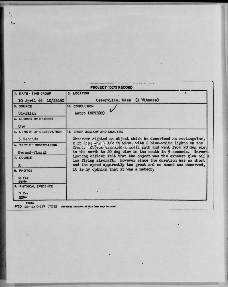A civilian witness in Osterville, Massachusetts, reported a rectangular object on April 10, 1966. The Air Force concluded the sighting was a meteor.