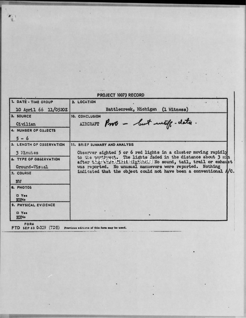 Project 10073 Record: Battlecreek, Michigan Sighting, 10 April 1966