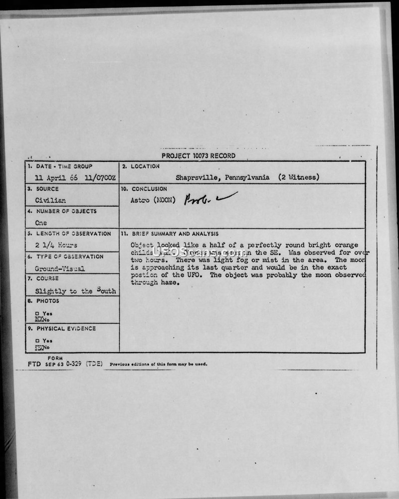 A civilian sighting of an orange object in Sharpsville, Pennsylvania, on 11 April 1966 was investigated by Project Blue Book. The object was officially identified as the moon viewed through haze.