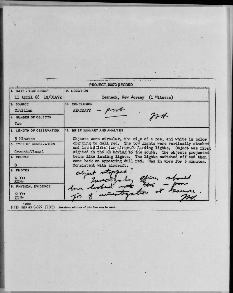 Project 10073 Record — UFO Sighting, Teaneck, New Jersey, 11 April 1966