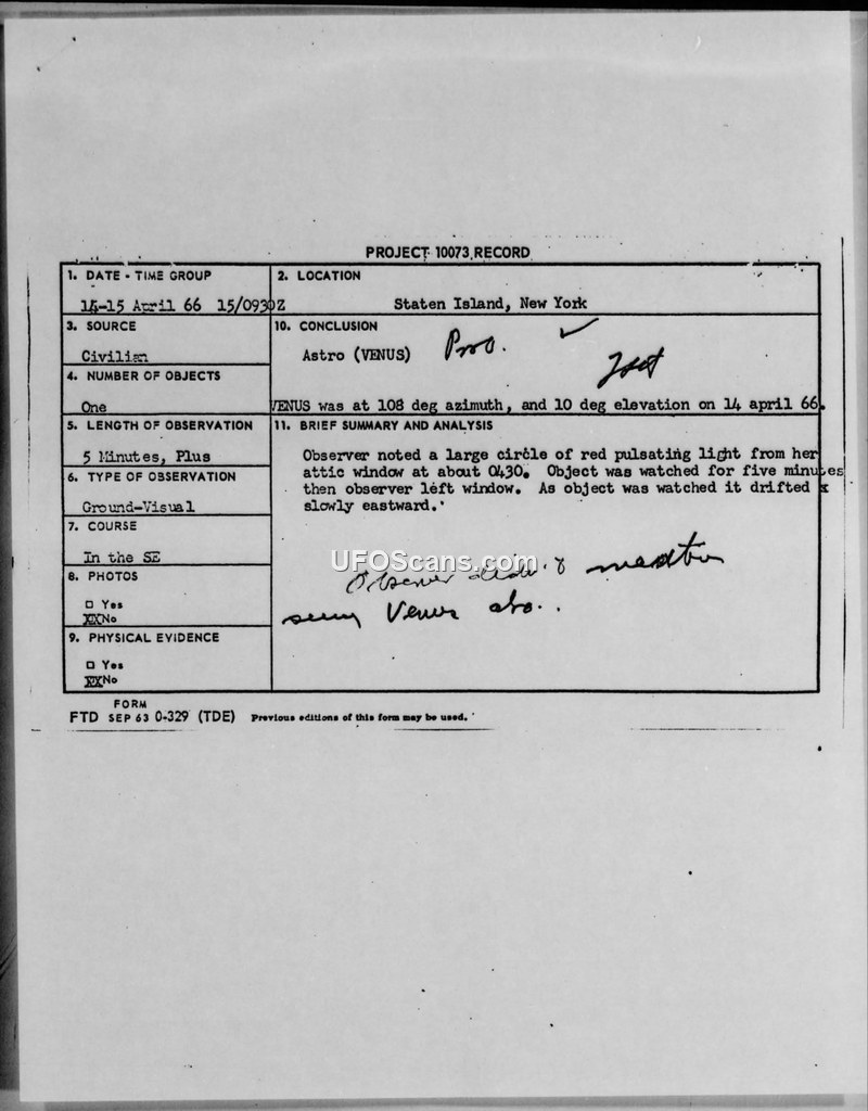 A civilian reported a pulsating red light over Staten Island in April 1966. Project Blue Book investigators concluded the object was the planet Venus.
