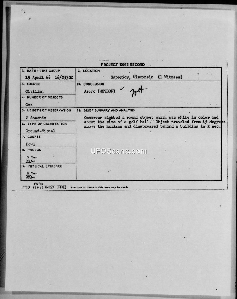 A civilian in Superior, Wisconsin, reported a two-second sighting of a white, golf-ball-sized object on 15 April 1966. The military investigation concluded the object was a meteor.
