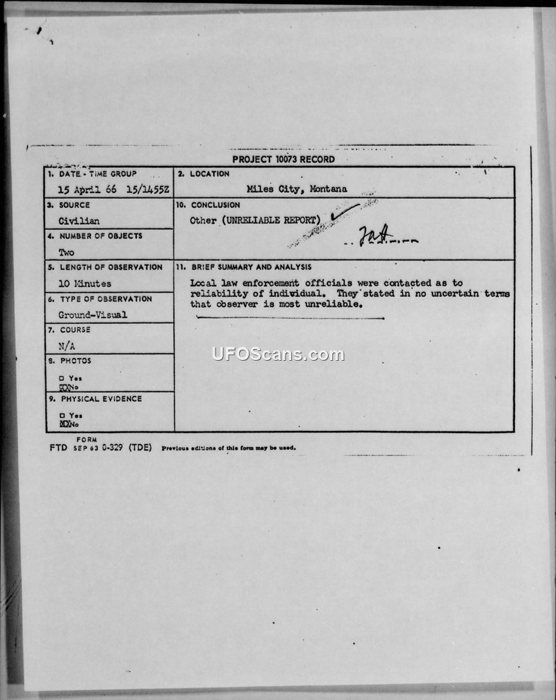 Project 10073 Record — Miles City, Montana, 15 April 1966