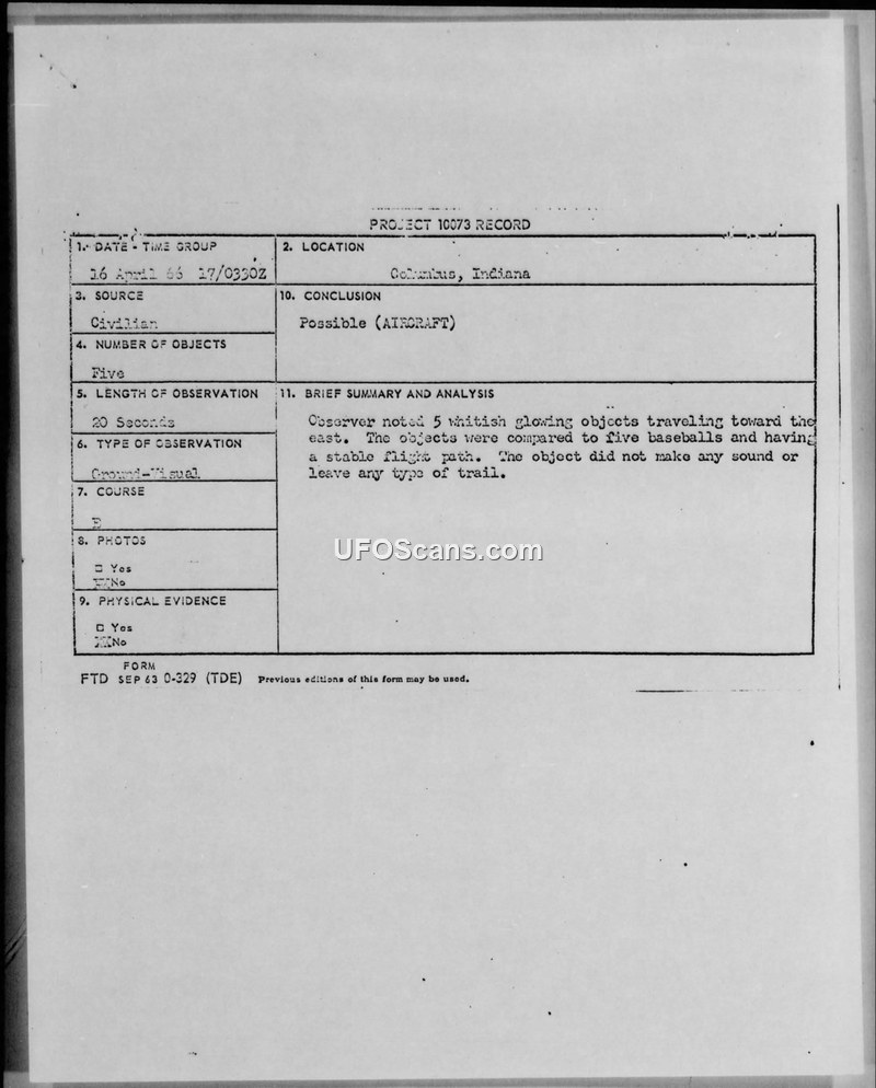 Project 10073 Record — Sighting Report, Columbus, Indiana, 16 April 1966