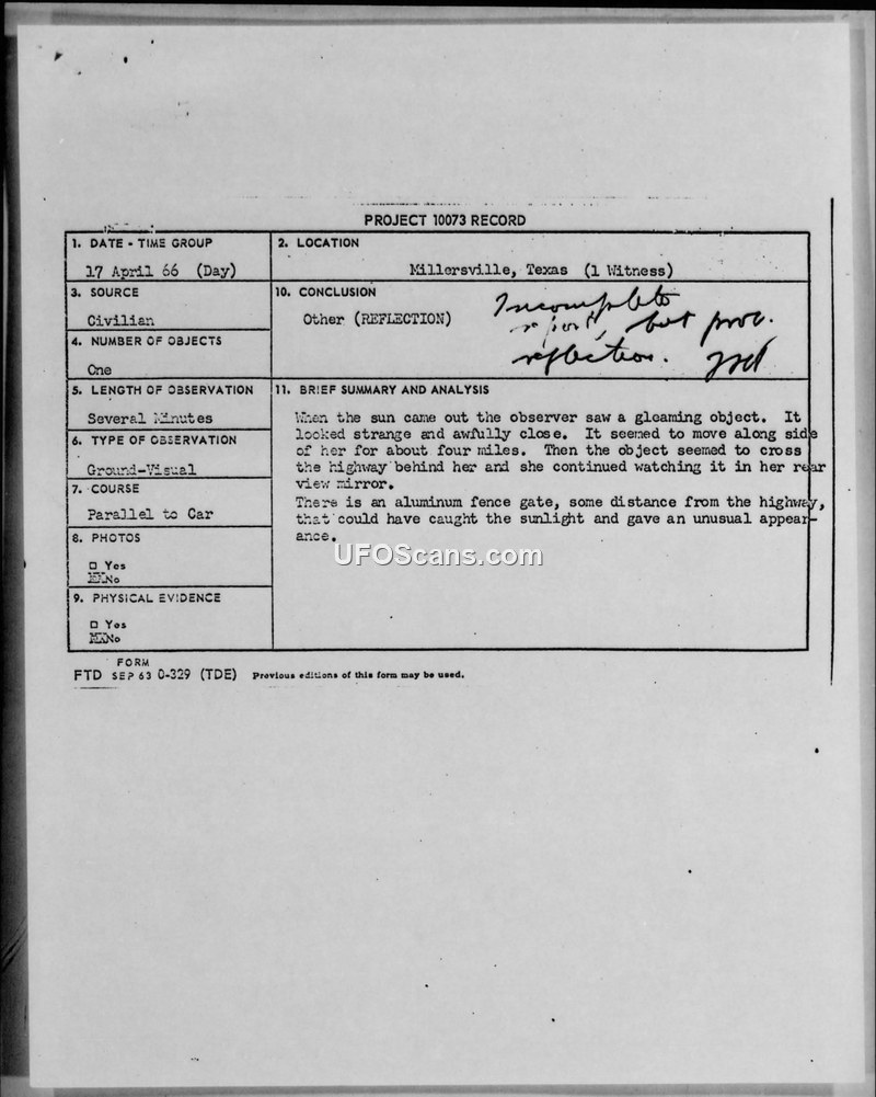 On 17 April 1966, a civilian observer reported an unidentified aerial phenomenon while driving on Farm Road 765 in Texas. The observer, a 23-year-old telephone operator trainee, stated that she noticed a gleaming, egg-shaped object while driving toward Highway 87. She described the object as being roughly the size of a Volkswagen, metallic or silver in color, and featuring a protrusion on the back and top. According to her account, the object moved parallel to her vehicle for approximately four miles at a speed of about 65 miles per hour before crossing the highway behind her. She observed the object for a total of eleven minutes, including time spent watching it in her rearview mirror. The observer noted that the weather had been cloudy with recent rain and hail, but the sun emerged during the sighting. The investigator, Major George A. Sherwood, Jr., conducted a follow-up investigation, which included visiting the scene and interviewing nearby residents. No other witnesses reported seeing the object, and no air traffic or balloon releases were recorded in the area. The investigator noted that the terrain consisted of freshly plowed fields and that an aluminum fence gate was present in the vicinity, which, when combined with heat waves, could produce a mirage effect. Major Sherwood characterized the observer as a stable person who was not seeking publicity, though he noted she appeared visibly shaken by the event. Ultimately, the official conclusion recorded on the project file was 'Other (REFLECTION).'