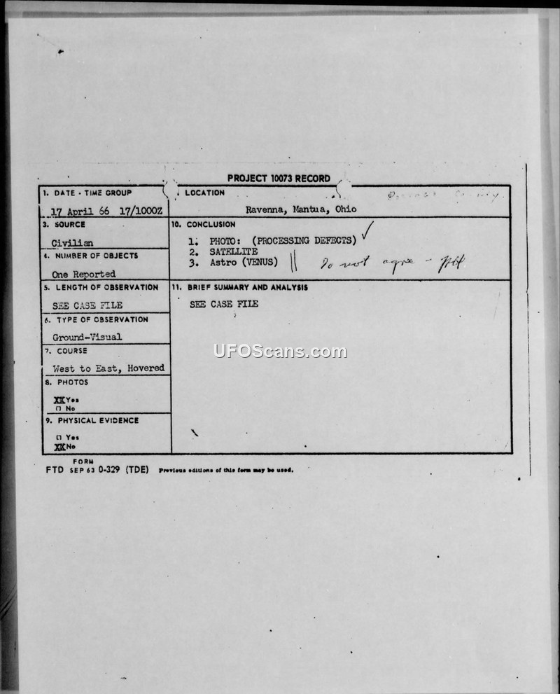 Project 10073 Record: UFO Sighting 17 April 1966, Ravenna, Mantua, Ohio