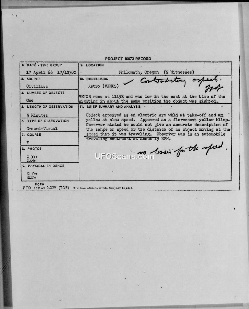 On April 17, 1966, a sighting of an unidentified aerial phenomenon was reported near Philomath, Oregon, by two witnesses, including Alvin Hockema, a grader operator. The witnesses observed a single, long, narrow, pencil-shaped object that appeared as a 'florescent yellow blimp.' The observer, who was in an automobile traveling southwest at approximately 15 MPH, described the object as appearing like an 'electric arc weld' at take-off and noted that it was yellow at slow speeds. The observation lasted for approximately five minutes. The witness stated that he could not provide an accurate description of the object's shape, speed, or distance. The report was initially processed by the 26th Air Division at Adair Air Force Station, Oregon, and forwarded to the Air Technical Intelligence Center at Wright-Patterson Air Force Base. Major A. F. Shiflett of the 26th Air Division noted that no preliminary analysis was offered regarding the cause of the sighting. Subsequently, Major Hector Quintanilla, Jr., Chief of Project Blue Book, sent correspondence to the witness stating that the initial information provided was insufficient for evaluation and requested the completion of an FTD Form 164. The final conclusion recorded in the Project 10073 record identifies the object as the planet Venus, noting that Venus rose at 1115Z and was low in the east at the time of the sighting, occupying approximately the same position as the reported object.