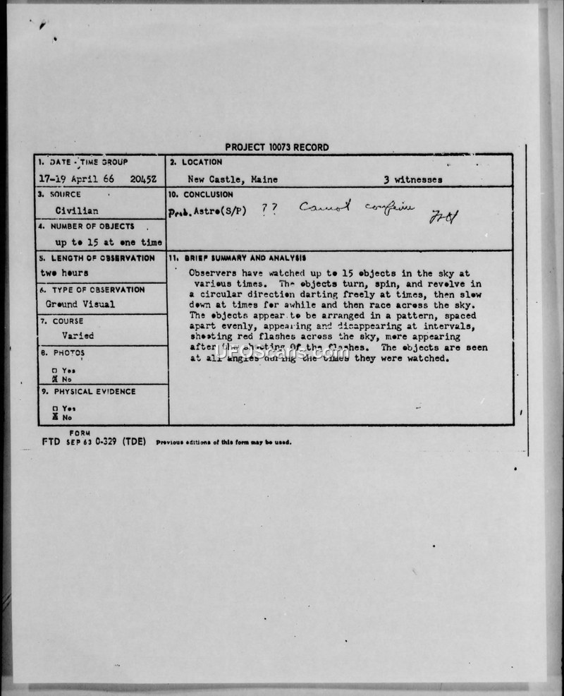 Project 10073 Record: Sighting Incident Report - New Castle, Maine, April 1966
