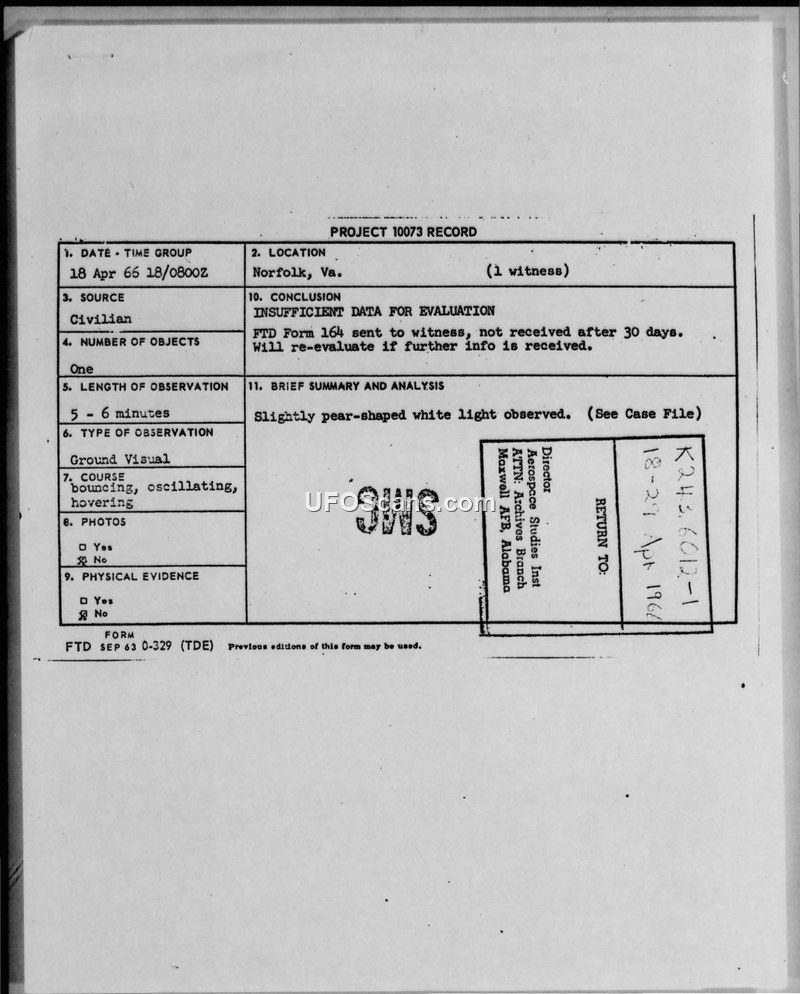 On 18 April 1966, a civilian witness in Norfolk, Virginia, reported observing a single, slightly pear-shaped, bright white light in the sky. The object was described as being the size of a baseball and exhibited behaviors including bouncing, oscillating, and hovering. During the observation, which lasted approximately five to six minutes, the witness reported that a smaller, brilliant light emerged from the bottom of the larger object and descended into the water, where it vanished. The larger object then descended to hover over the location where the smaller object had entered the water before climbing rapidly and disappearing from view. The investigation, conducted by Captain James R. Lewis, Jr. of the 4500th Air Base Wing, included a review of local weather data and a check of Naval, Air Force, NASA, and FAA installations, none of which could account for the sighting. Captain Frederick A. Trippe of the 4500 Air Base Wing Instrument School confirmed that no planets were visible in the area at the time. Despite these efforts, the Air Force concluded that the information provided was insufficient for evaluation, and the witness failed to return the requested FTD Form 164. The report concludes that the investigator was unable to substantiate or disprove the validity of the sighting.