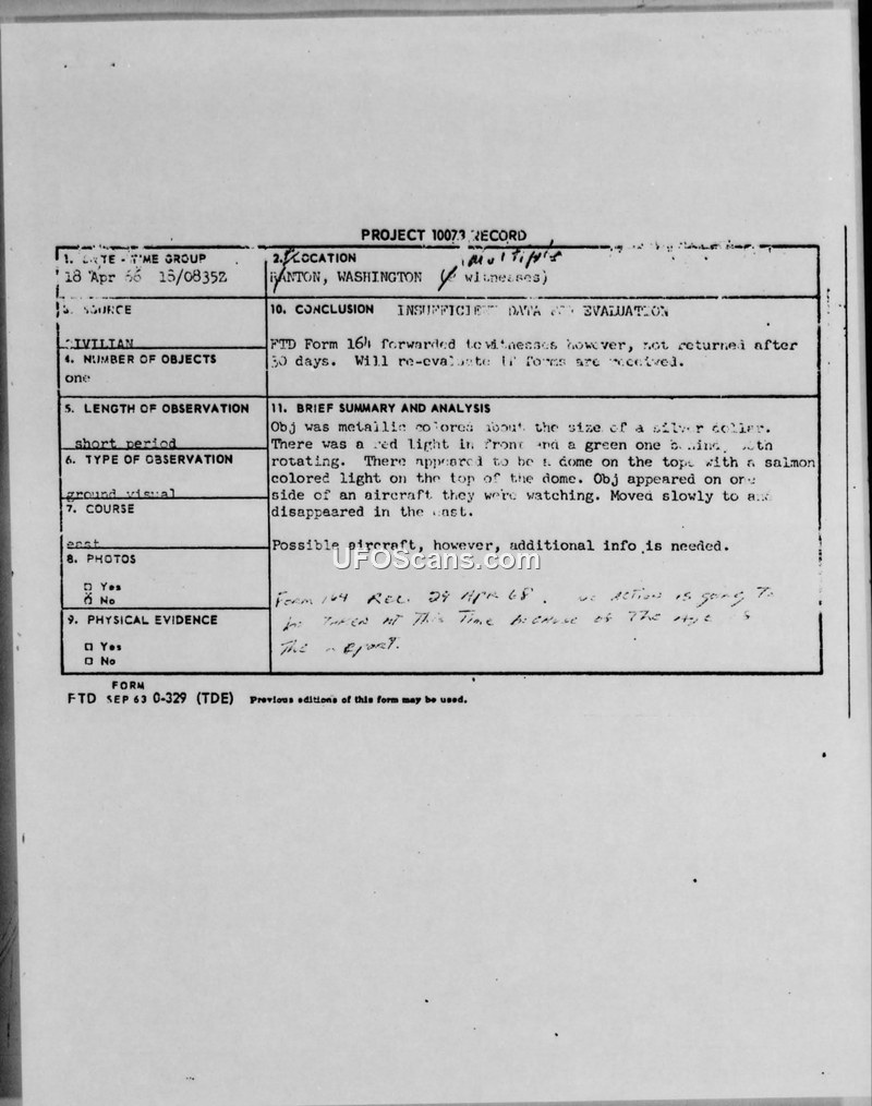 A civilian witness in Renton, Washington, reported a metallic, dome-shaped UAP with rotating lights on 18 April 1966. The Air Force investigated the sighting under Project 10073 but concluded that the data was insufficient for a definitive evaluation.