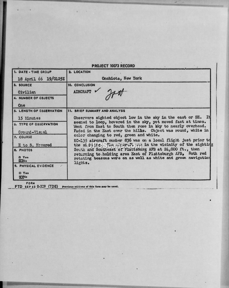 Project 10073 Record — Onchiota, New York, 18 April 1966