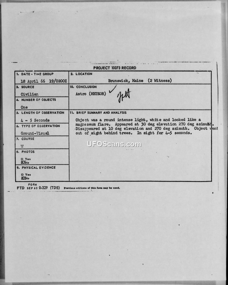 Project 10073 Records — Brunswick, Maine Sightings (April 1966)