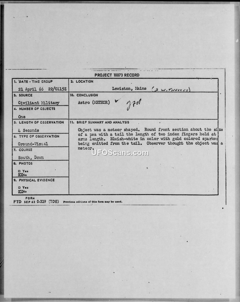 On April 21, 1966, at 0115Z, a sighting of an unidentified aerial phenomenon was reported in Lewiston, Maine. The primary witness, 2nd Lt. Stanley W. Karod of the 4626 Support Squadron, was traveling north on U.S. Route 201 on a motorcycle when his passenger pointed out an object in the sky. The object was described as meteor-shaped with a round front section roughly the size of a pea held at arm's length, and a tail approximately the length of two index fingers held at arm's length. The object was observed for four seconds as it moved in a southward, downward trajectory, appearing to burn itself out. The object was noted to be bluish-white in color, emitting gold-colored sparks. No sound was heard, though the witness noted that the motorcycle itself produced a significant amount of noise. Weather conditions were reported as clear. The sighting was investigated by Captain Donald C. Westlake, Chief of Intelligence for the 36th Air Division, who concluded that the object was a meteor. The report was filed under Project 10073 in accordance with Air Force Regulation 200-2.