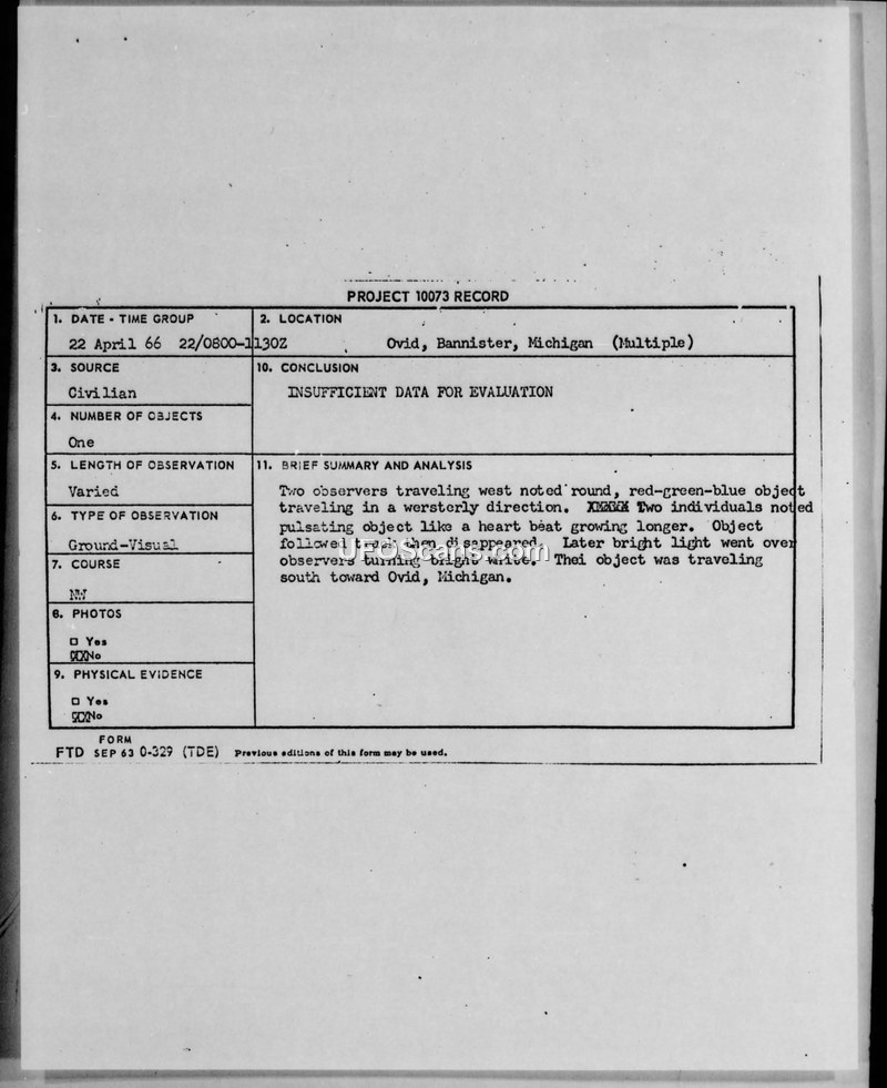Report of Unidentified Flying Object (UFO) — Ovid, Bannister, Michigan, 22 April 1966