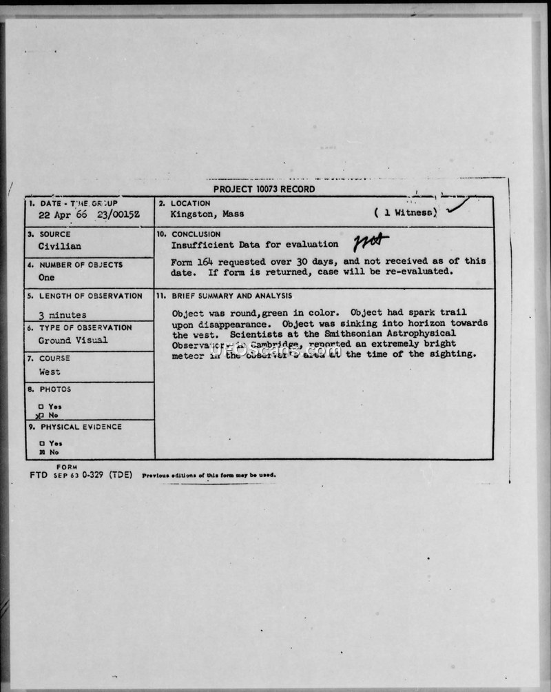 Project 10073 Record: Sighting in Kingston, Massachusetts, 22 April 1966
