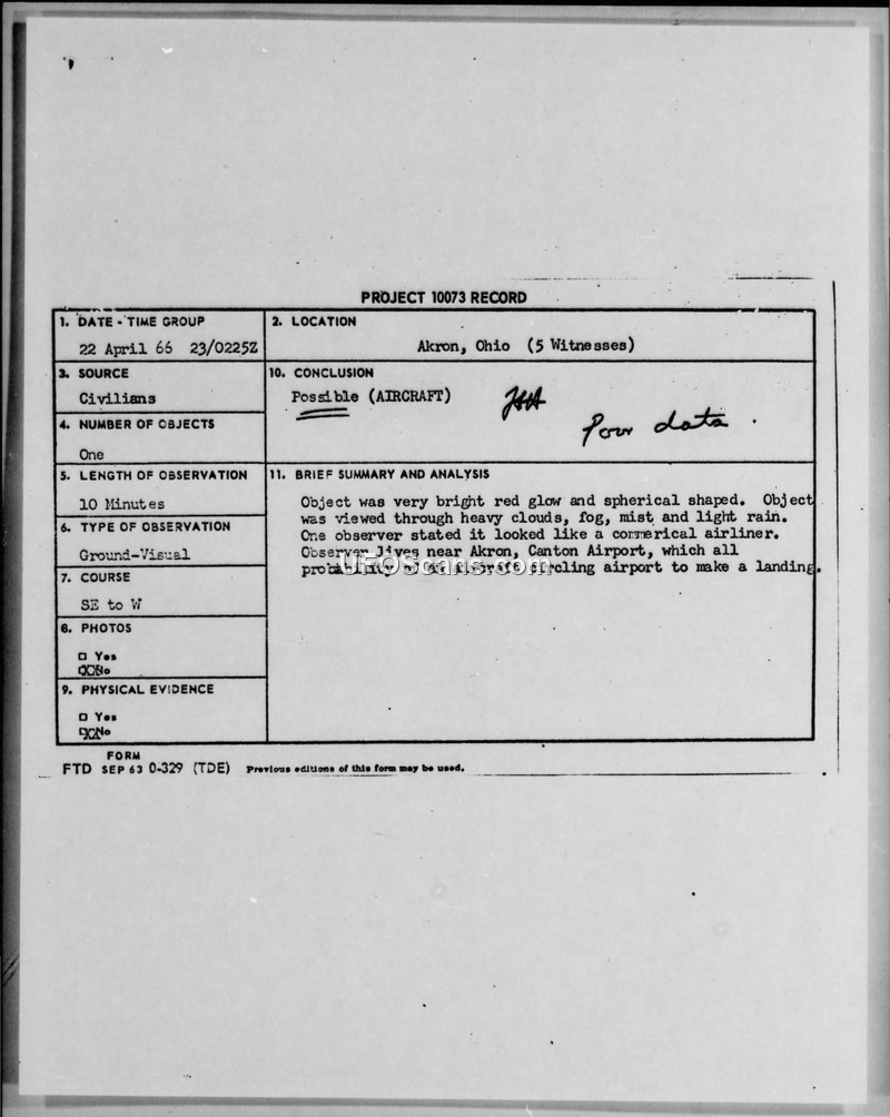 Project 10073 Record — Akron, Ohio, 22 April 1966