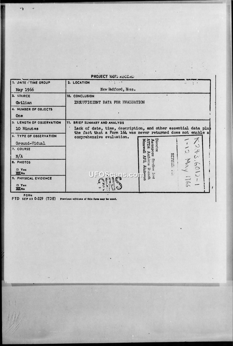 A civilian report of a UFO sighting in New Bedford, Massachusetts, was deemed insufficient for evaluation by Project Blue Book due to a lack of data and the witness's failure to return a formal reporting form. The file also contains a secondary, unrelated report of a 'mother ship' sighting in Westport, Massachusetts.